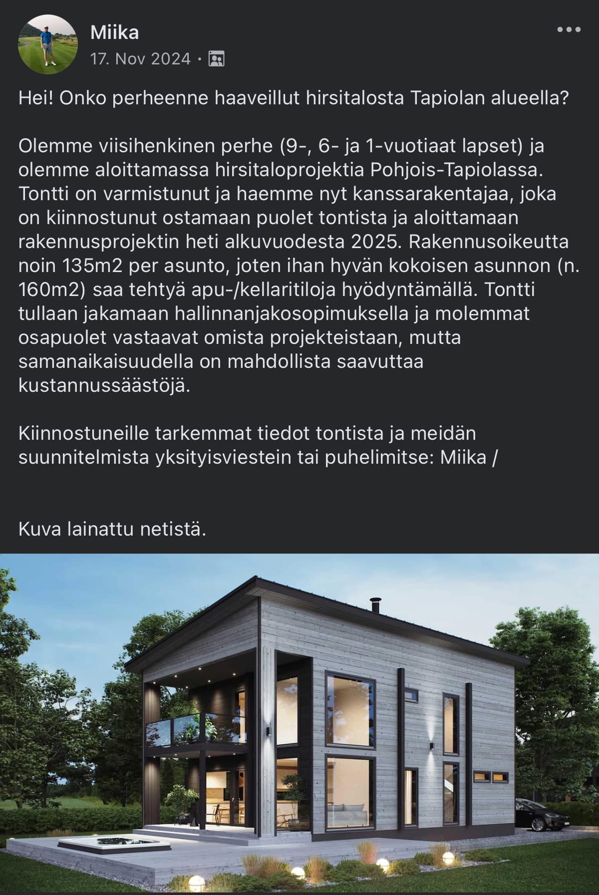 Päätimme aloittaa kanssarakentajan haun julkaisemalla ilmoituksen alueen Facebook-ryhmässä ja katsoa, johtaako se mihinkään. Sunnuntaiaamuna 17.11. hieman epäillen painoin julkaisunappia. Noin puolen tunnin kuluttua alkoi tulla viestejä ja puheluita. Suurin osa sunnuntaista menikin sitten puhelimessa kertoen suunnitelmistamme ja haastattelemalla potentiaalisia tulevia naapureita.