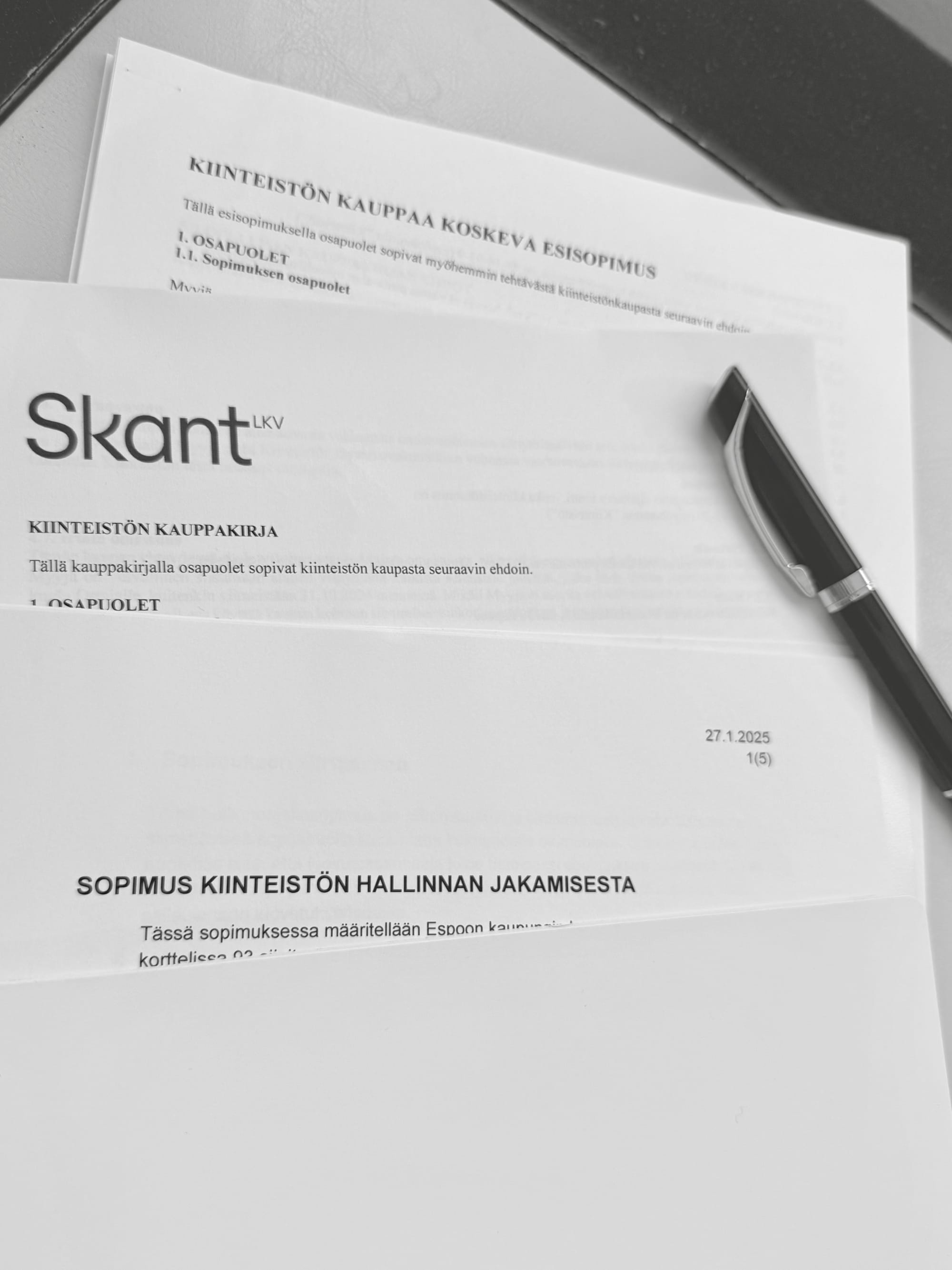Olimme sopineet välittäjän kanssa, että voimme lisätä esisopimuksen teon jälkeen varsinaiseen kauppakirjaan vielä kanssaostajan, mikäli sellaisen löydämme. Nyt kun tämä toinen perhe löytyi niin nopeasti jo ennen esisopimuksen allekirjoitusta, saimme heidät lisättyä siihen. Esisopimus allekirjoitettiin muuttolaatikoiden keskellä vanhassa kodissamme 29.11.2024. Muste papereissa ei ollut ehtinyt vielä edes kuivua, kun ovikello soi ja muuttomiehet saapuivat siirtämään koko omaisuutemme väliaikaiseen vuokra-asuntoon. Tehokas aamu siis! Esisopimuksen yhteydessä sovimme varsinaiseksi kaupantekopäiväksi 27.1.2025 ja saimme myyjäpuolelta valtakirjat, joilla voimme lähteä jo edistämään vanhan rakennuksen purkulupaa sekä uusien talojemme rakennuslupia.